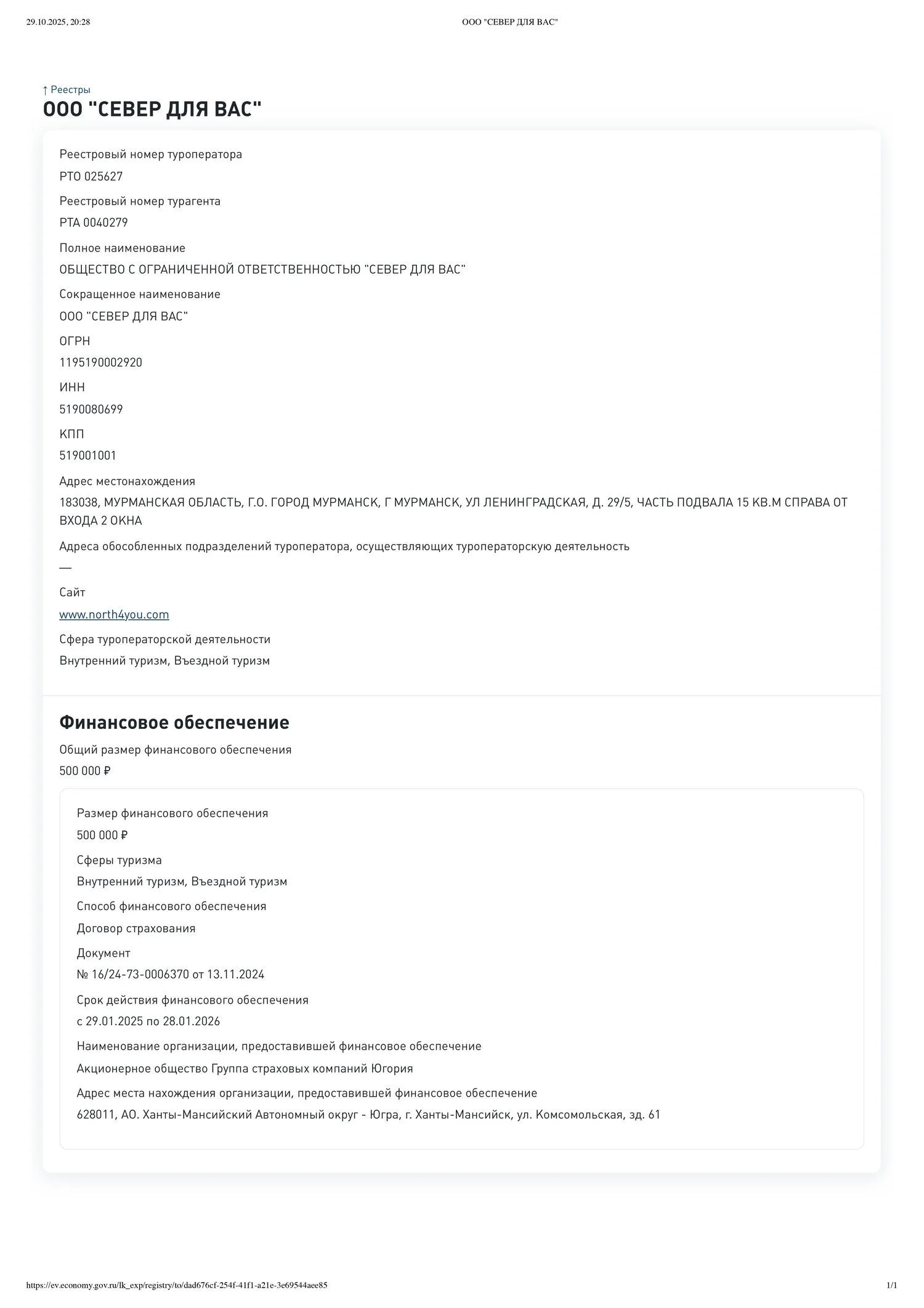 Юридический адрес 183038, Мурманская область, г. Мурманск, Ленинградская ул., 29/5