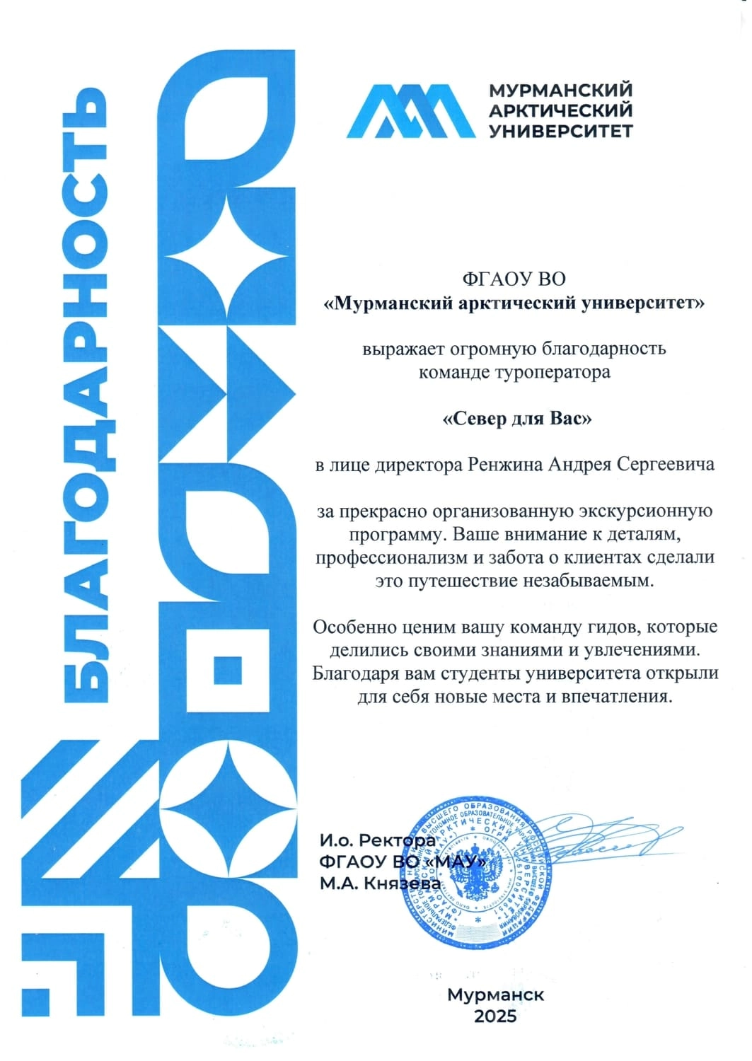 Мурманский туроператор «Север для Вас» знакомит гостей с русским севером с 2016 года, и за это время мы накопили 1000+ отзывов о наших турах и экскурсиях по Мурманской области. Мы будем рады стать вашим проводником и познакомить с частичкой Арктики!