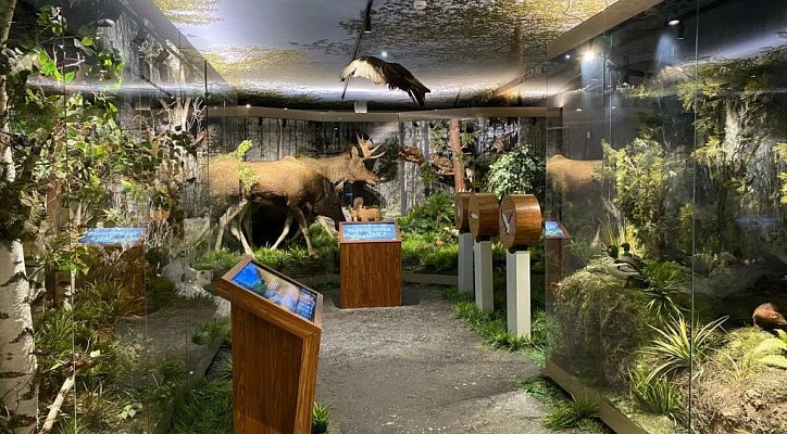 - Зал природы. Вы увидите геологическое богатство Кольского полуострова: уникальные минералы Хибин, образцы апатито-нефелиновых руд. Диорамы с таксидермическими скульптурами животных познакомят с фауной тундры и тайги.